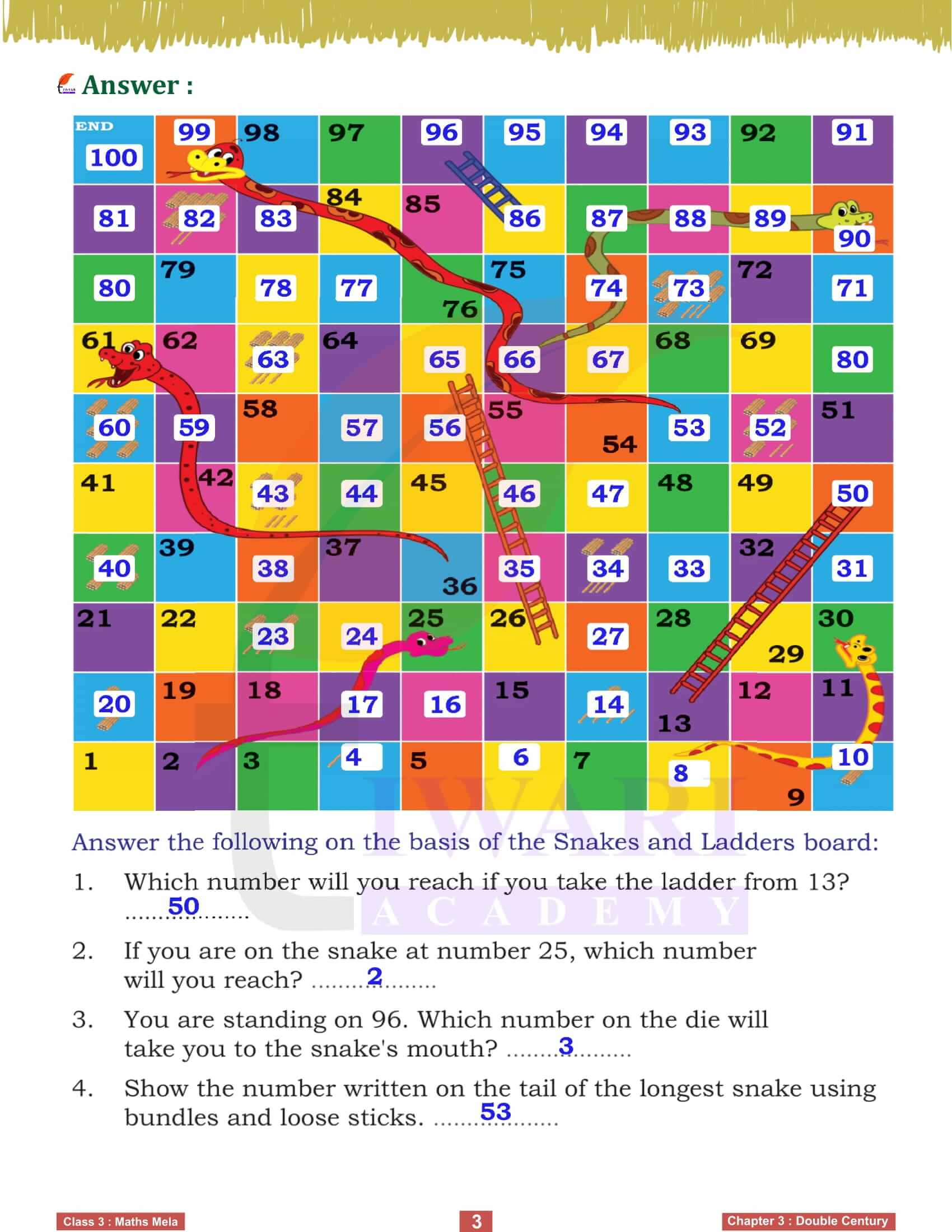 NCERT Solutions for Class 3 Maths Mela Chapter 3 Double Century in Hindi and English Medium revised and updated for session 2025-26. Chapter 3 introduces students to the concept of large numbers, specifically up to 200. Through stories and practical examples, students learn to read, write and compare these numbers. Activities include counting objects, filling number grids and understanding place value, making large numbers approachable and fun.
