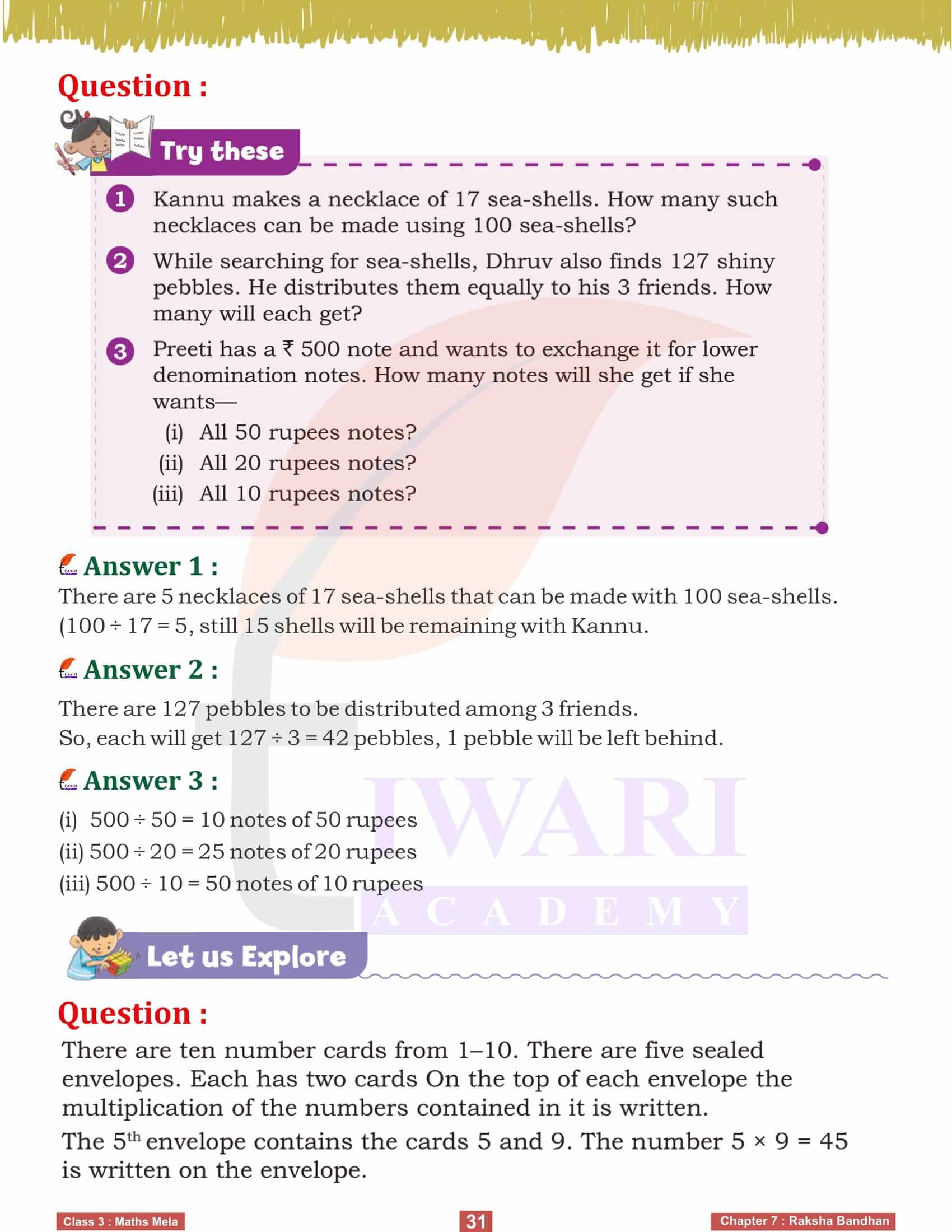 Class 3 Maths chapter 7 concludes with creative activities such as making necklaces with sea-shells and solving division problems using repeated subtraction. Anu encourages students to solve problems involving large numbers by breaking them down into simpler, manageable parts. For example, using repeated subtraction to determine how many necklaces can be made from a certain number of sea-shells or how many notes of different denominations can be exchanged for a larger note. These activities ensure that students understand division deeply and can apply it in various situations.