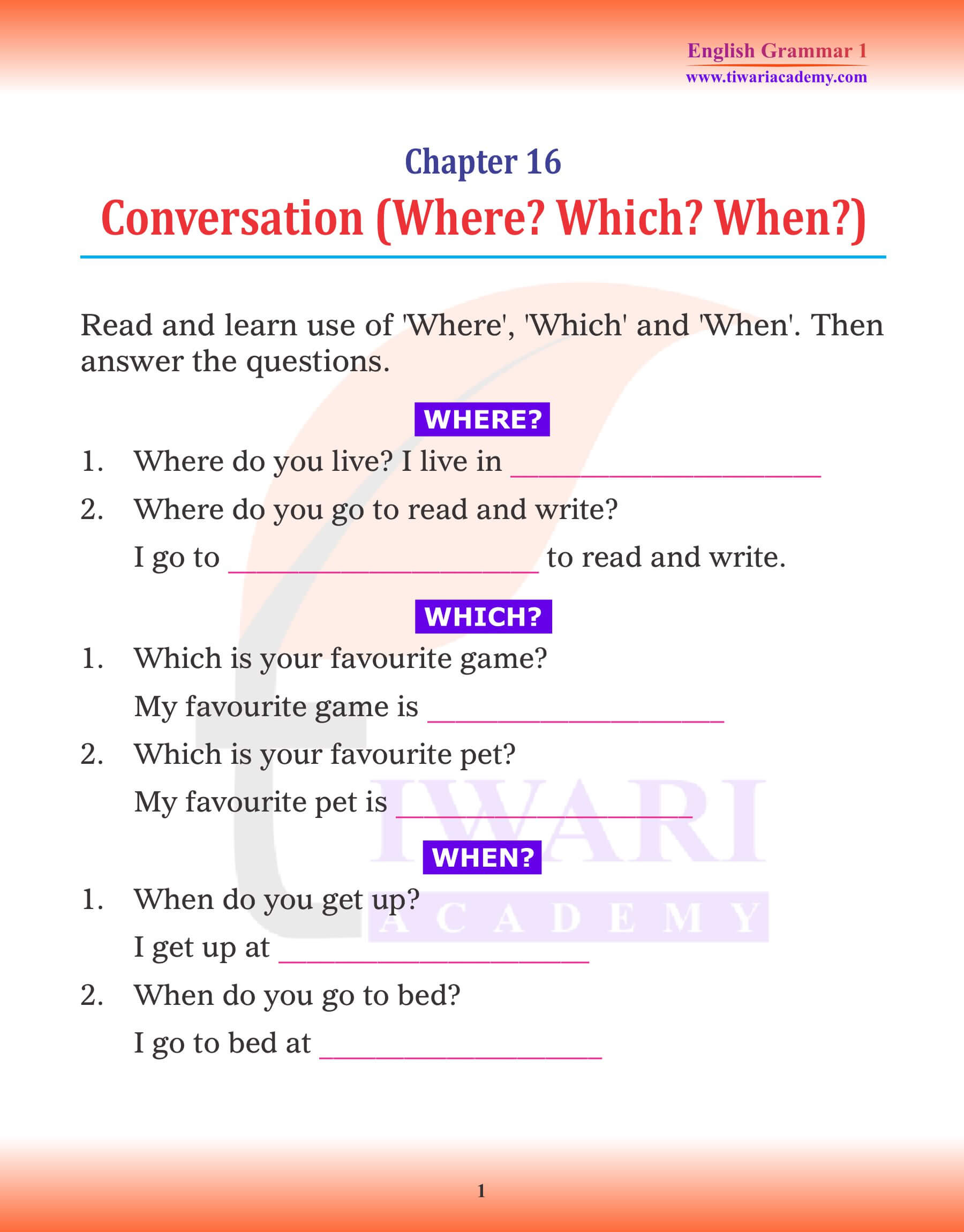 NCERT Solutions for Class 1 English Grammar Chapter 16 Conversation using the words like Where, Which, and When. These are helpful words to ask questions or know something about any fact. A student should know the proper way of using these types of words like where, which, and when. Class 1 English Grammar Chapter 16 helps to understand these conversation words with the illustration.
