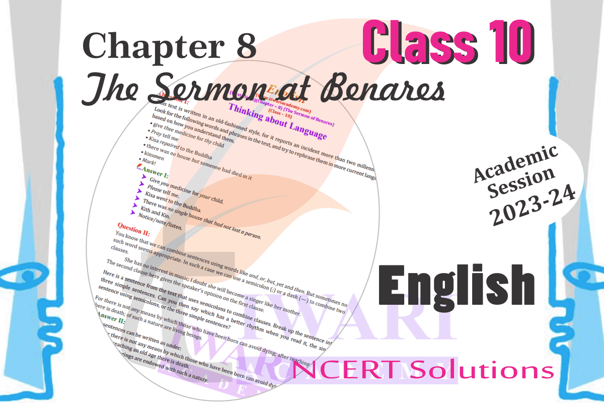 NCERT Solutions for Class 10 English First Flight Chapter 8 The Sermon of Benares and the poem For Anne Gregory in Hindi Medium (Hindi Translation) with Summery in English and Hindi. By studying the Tiwari Academy NCERT Solutions, students can prepare for exams more effectively. Tiwari Academy Class 10 English NCERT Solutions are a valuable resource for students who want to excel in their studies and to prepare for success in their future. The answers of class 10 English chapter 8 is modified as per new NCERT textbooks issued for academic session 2025-26.