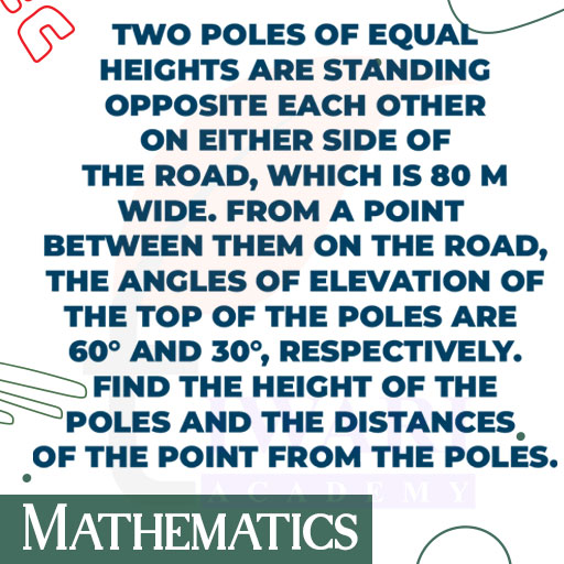 Trigonometry, an essential branch of mathematics, is often applied in urban planning and design, particularly in situations involving measurements and spatial relationships. A common application is determining the heights of structures and distances between them when direct measurement is not feasible. The problem at hand involves two poles of equal height on opposite sides of an 80-meter-wide road. From a point on the road, the angles of elevation to the tops of these poles are given. This scenario is a practical demonstration of how trigonometry can be used to solve real-world problems in urban and civil engineering.