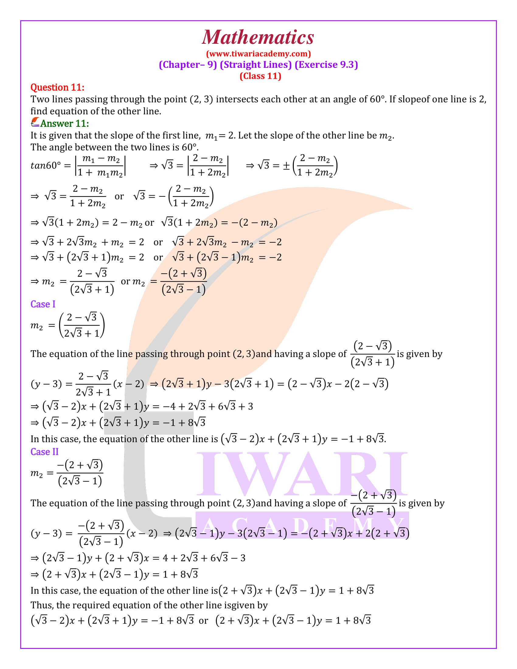 NCERT Solutions for Class 11 Maths Exercise 9.3 Straight Lines in English and Hindi Medium updated for CBSE session 2025-26. Solutions of ex. 9.3 in 11th mathematics are based on revised syllabus and rationalised books issued by NCERT for academic year 2025-26.