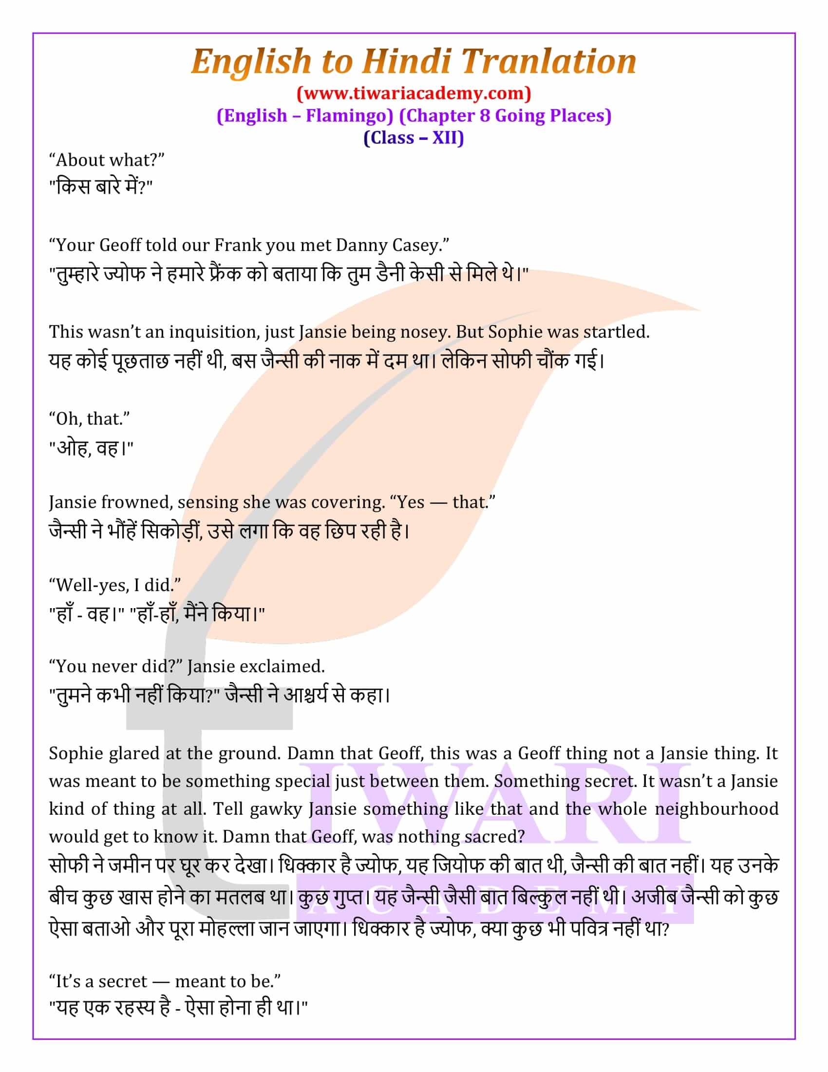 NCERT Solutions for Class 12 English Chapter 8 Going Places Flamingo with Hindi Translation revised and updated for new session 2025-26. Class 12 English Flamingo solutions contains NCERT textbook exercises, English to Hindi Translation of chapter, MCQ and extra question answers which are important for exams