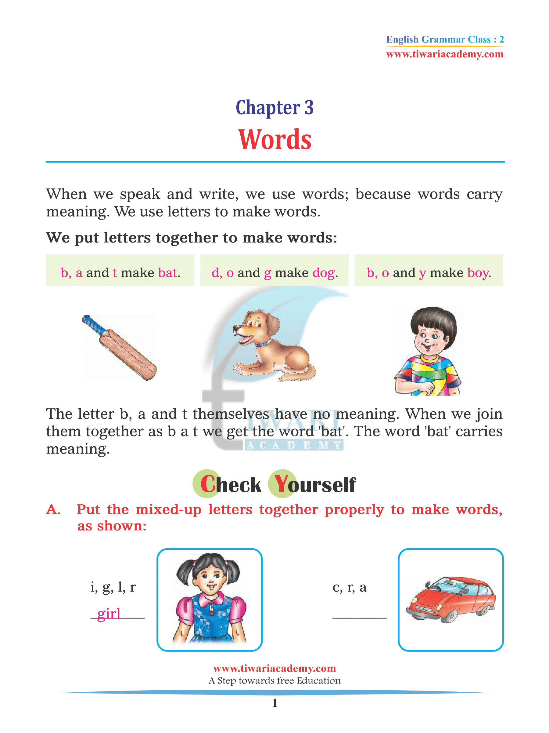 Class 2 English Grammar Chapter 3 Words with explanation via examples and assignments updated for new academic session 2025-26. Students of Class 2 can download English Grammar chapter 3 contents in PDF to it offline. All the contents on Tiwari Academy are free to use without any registration. We never disturb the users by call or messaging. Feel free to use the contents available on websites or app.