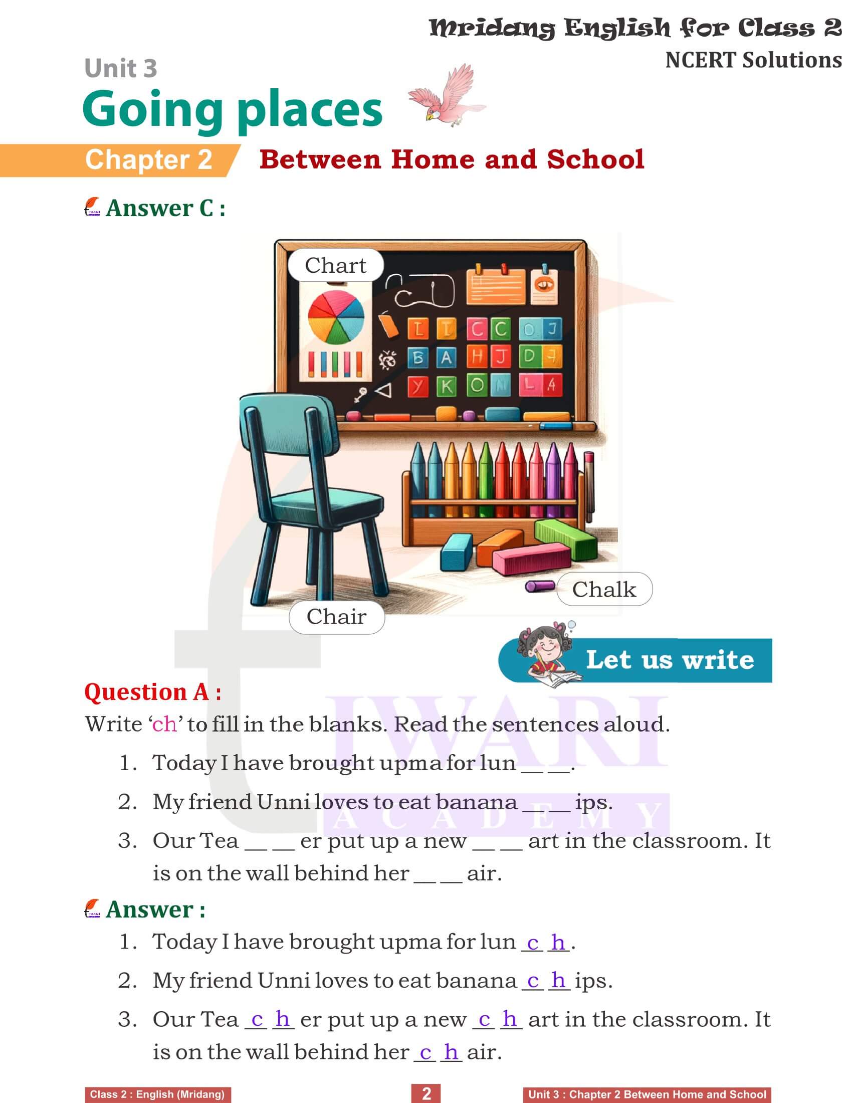 NCERT Solutions for class 2 English Mridang new addition Unit 3 Going Places Chapter 1 Come Back Soon, Chapter 2 Between Home and School and Chapter 3 This is My Town for session 2025-26. Question answers of all three chapters of unit 3 in class 2 English are given here in simple format.