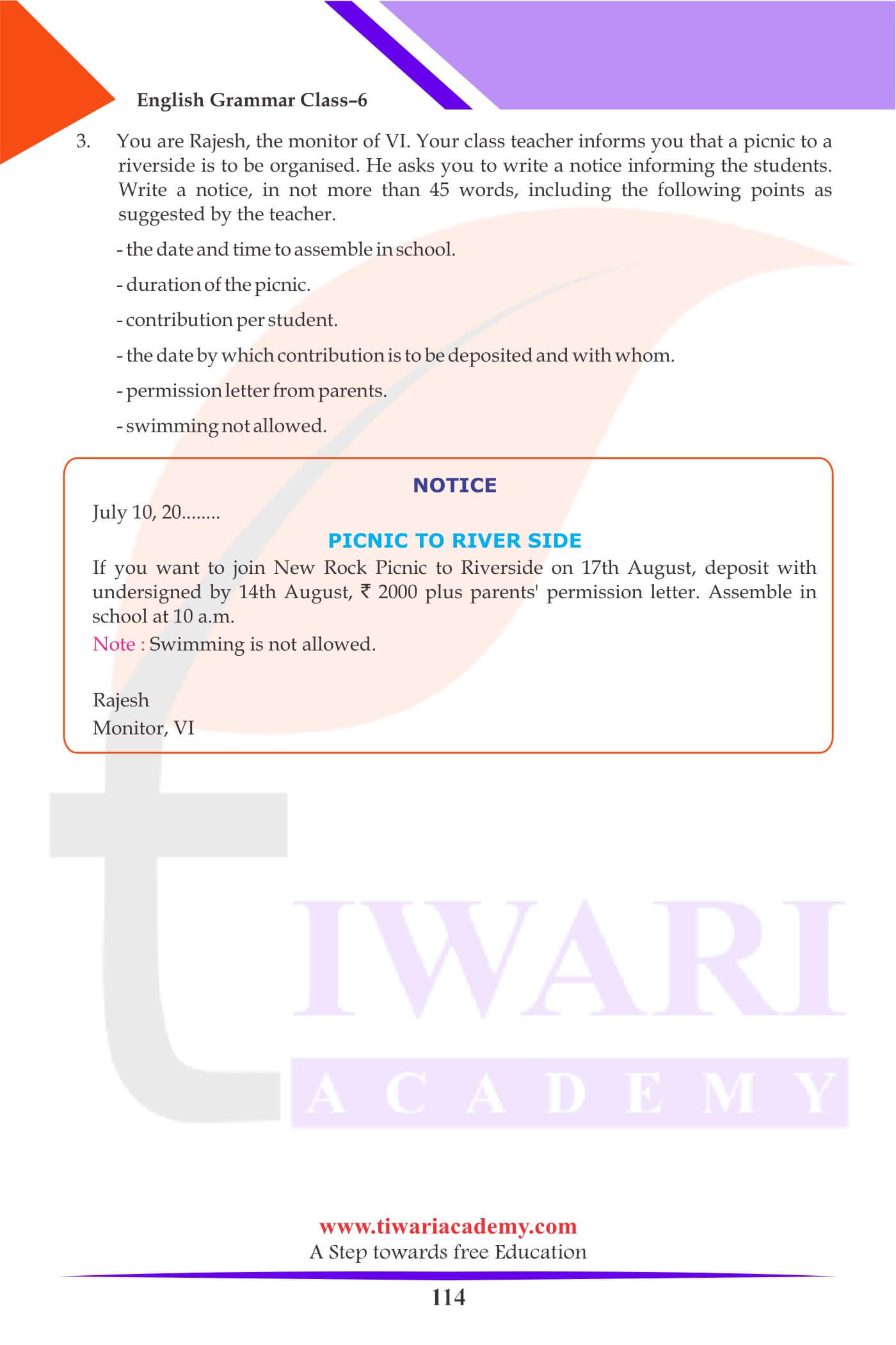 Class 6 English Grammar Chapter 26 Notice Writing. A notice is a handwritten, typed or printed piece of news or information, usually displayed publicly, say, on a notice board. Here, you will learn how to make a short notice using the given information.
