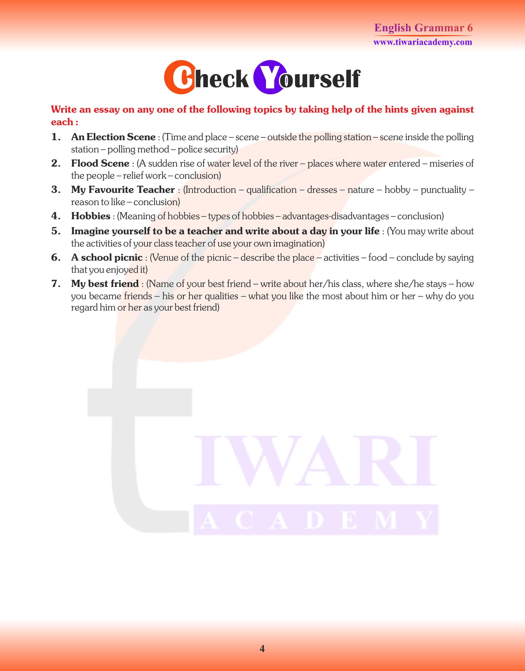 Class 6 English Grammar Chapter 30 Essay Writing. It is an art to write an essay. An essay is an original piece of composition. It is the best device to test a person’s written expression. An essay consists of a number of paragraphs, all related to one topic. We express our ideas and opinions on it. Before writing an essay, it is better to prepare an outline. Write down all the ideas that occur to you on the subject. Then fill up the gaps and complete your essay.