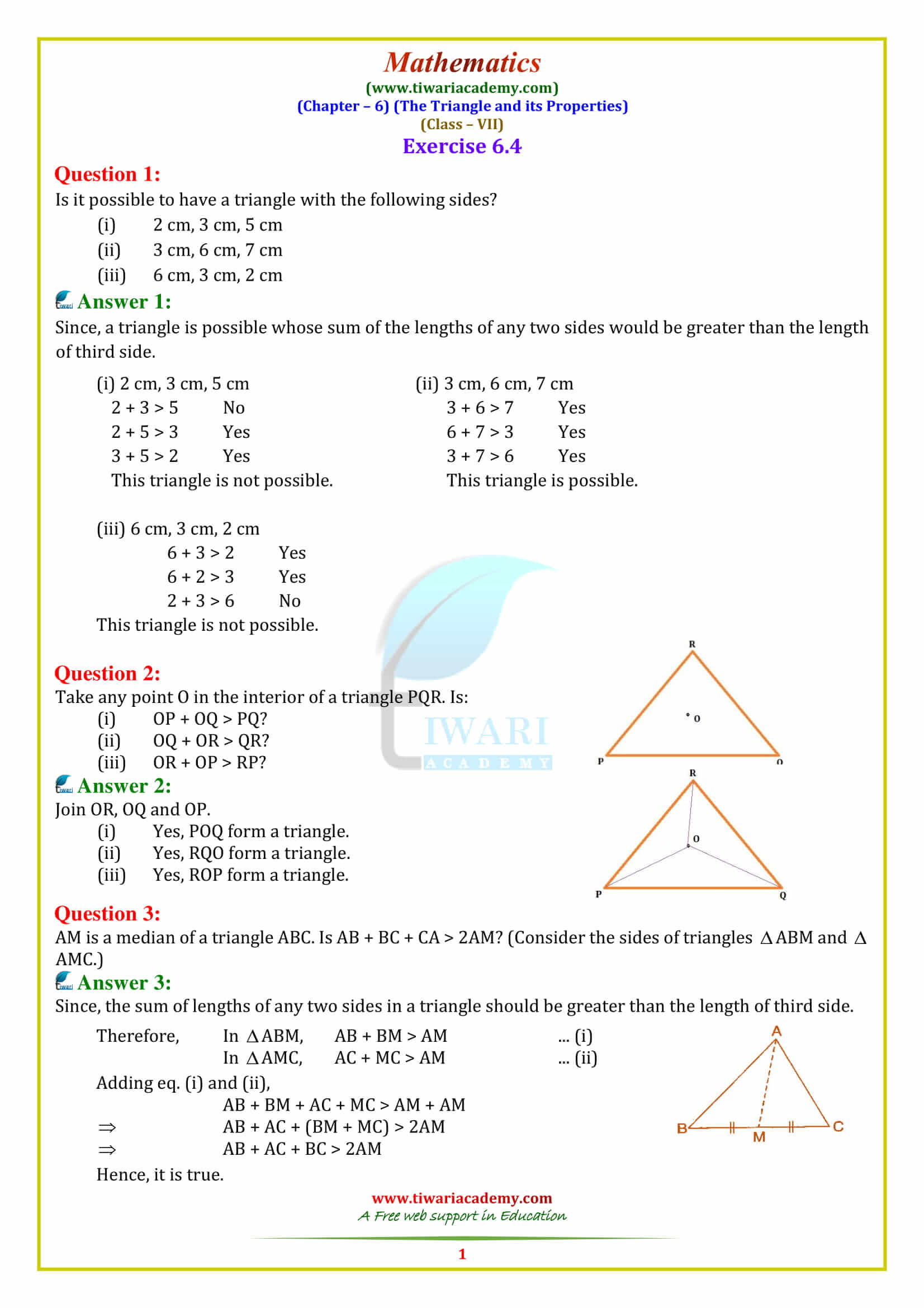 The chapter 6 of 7th mathematics also includes real-world applications of triangles and their properties, such as constructing buildings, designing bridges, and using trigonometry in various fields. We are working to provide the best NCERT Solutions and contents free of cost for you. The changes made is as per students suggestions. Various exercise questions that involve applying the concepts learned in the chapter. These questions cover topics like finding missing angles, verifying properties of triangles, solving practical problems involving triangles, and more. The opportunities are still there for improvement, so please suggest us to make changes for the session 2025-26. It’s important to read the chapter thoroughly, pay attention to definitions, theorems, and proofs, and practice solving the exercise questions. Understanding the properties of triangles is essential not only for this chapter but also for more advanced geometry concepts you’ll encounter in the future. Thanks for your advice so far.