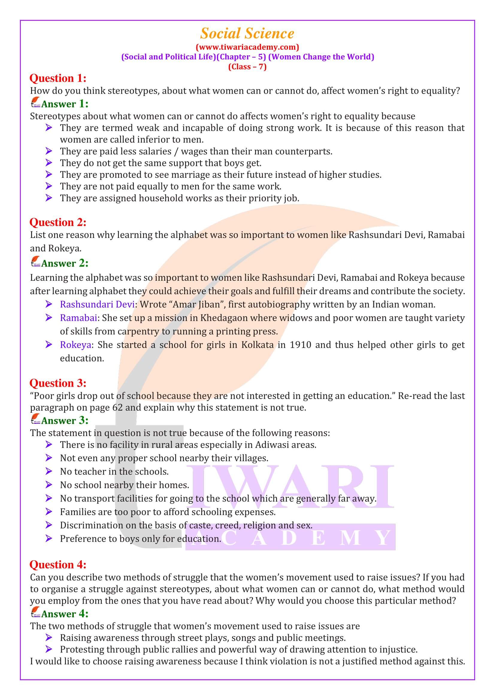 CBSE NCERT Solutions for Class 7 Social Science Political Science Chapter 5 Women Change the World Unit 3 in Hindi and English Medium is given in updated format for the new academic session 2025-26. Download Tiwari Academy’s NCERT solutions in PDF form and Offline Apps from Play Store for offline use.
