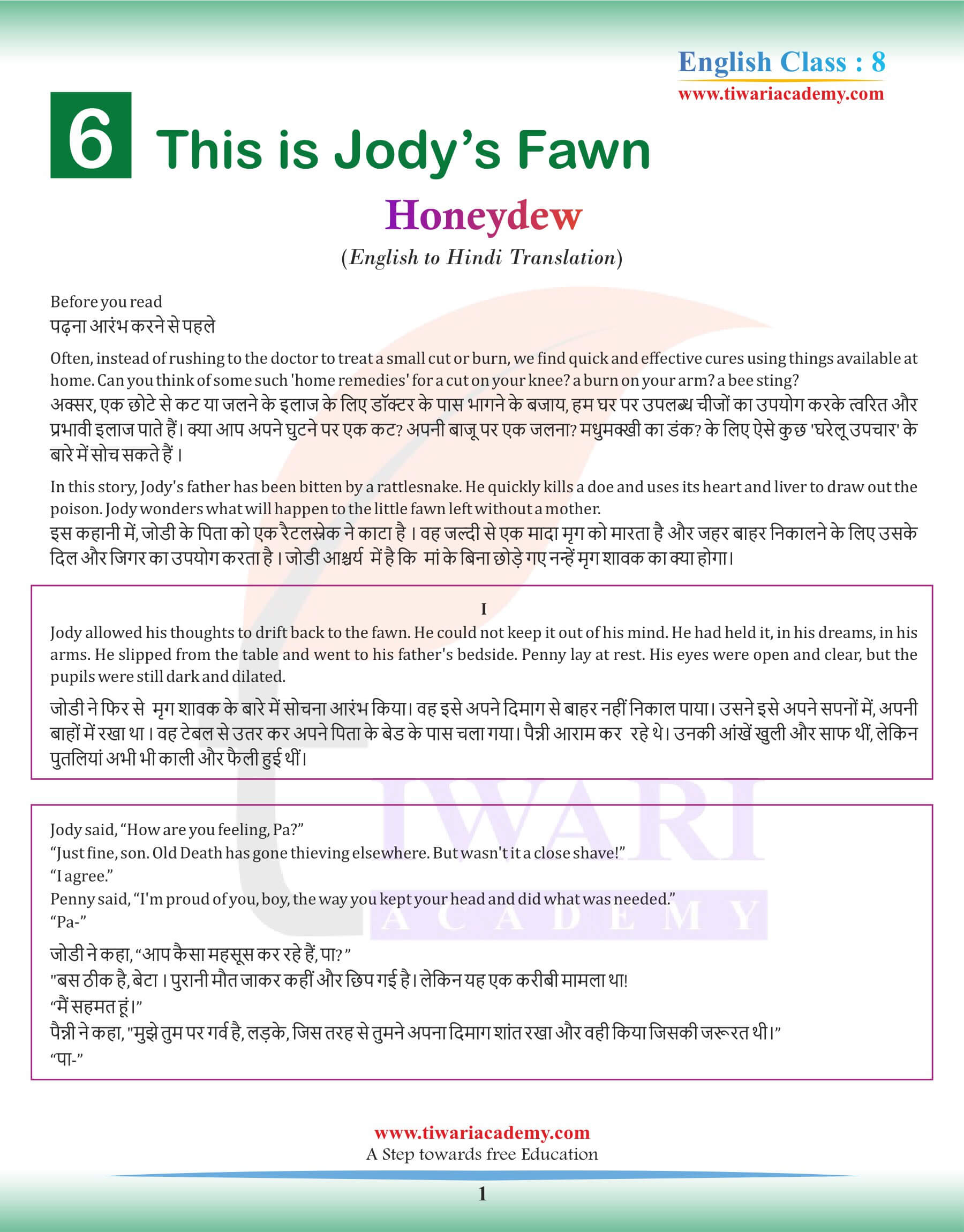 NCERT Solutions for Class 8 English Honeydew Chapter 6 This is Jody’s Faun Summary in Hindi and English Medium with Hindi Translation modified for academic session 2025-26. All the question answers of comprehension check, exercises question answers, working with language and working with the text. Extra question answers for the preparation of school test and terminal exams. The solutions of 8th English is modified according to rationalised NCERT books issued for 2025-26 exams.