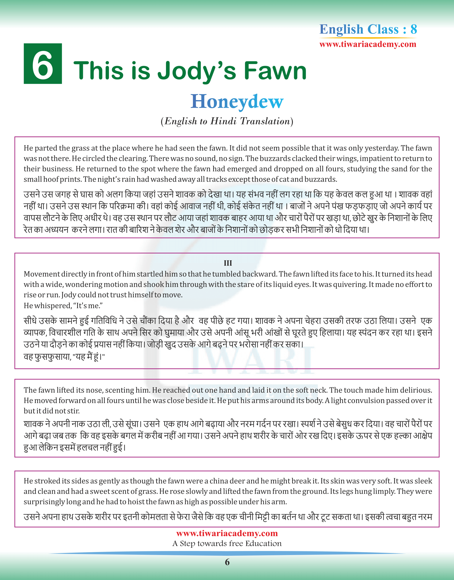 NCERT Solutions for Class 8 English Honeydew Chapter 6 This is Jody’s Faun Summary in Hindi and English Medium with Hindi Translation modified for academic session 2025-26. All the question answers of comprehension check, exercises question answers, working with language and working with the text. Extra question answers for the preparation of school test and terminal exams. The solutions of 8th English is modified according to rationalised NCERT books issued for 2025-26 exams.
