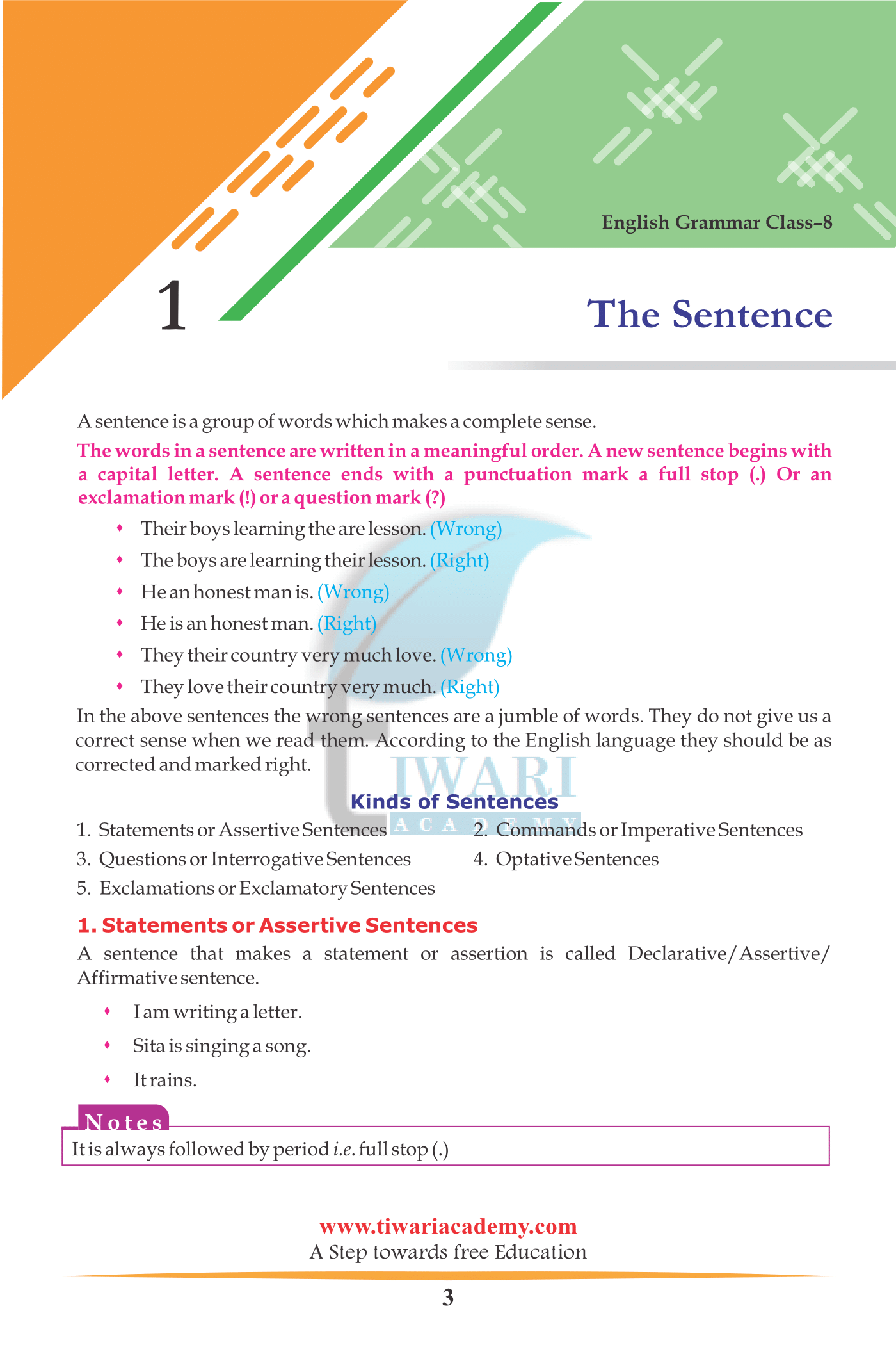 Class 8 English Grammar Chapter 1 The Sentence. A sentence is a group of words which makes a complete sense. The words in a sentence are written in a meaningful order. A new sentence begins with a capital letter. A sentence ends with a punctuation mark a full stop (.) Or an exclamation mark (!) or a question mark (?). The wrong sentences are a jumble of words. They do not give us a correct sense when we read them. According to the English language they should be as corrected and marked right.