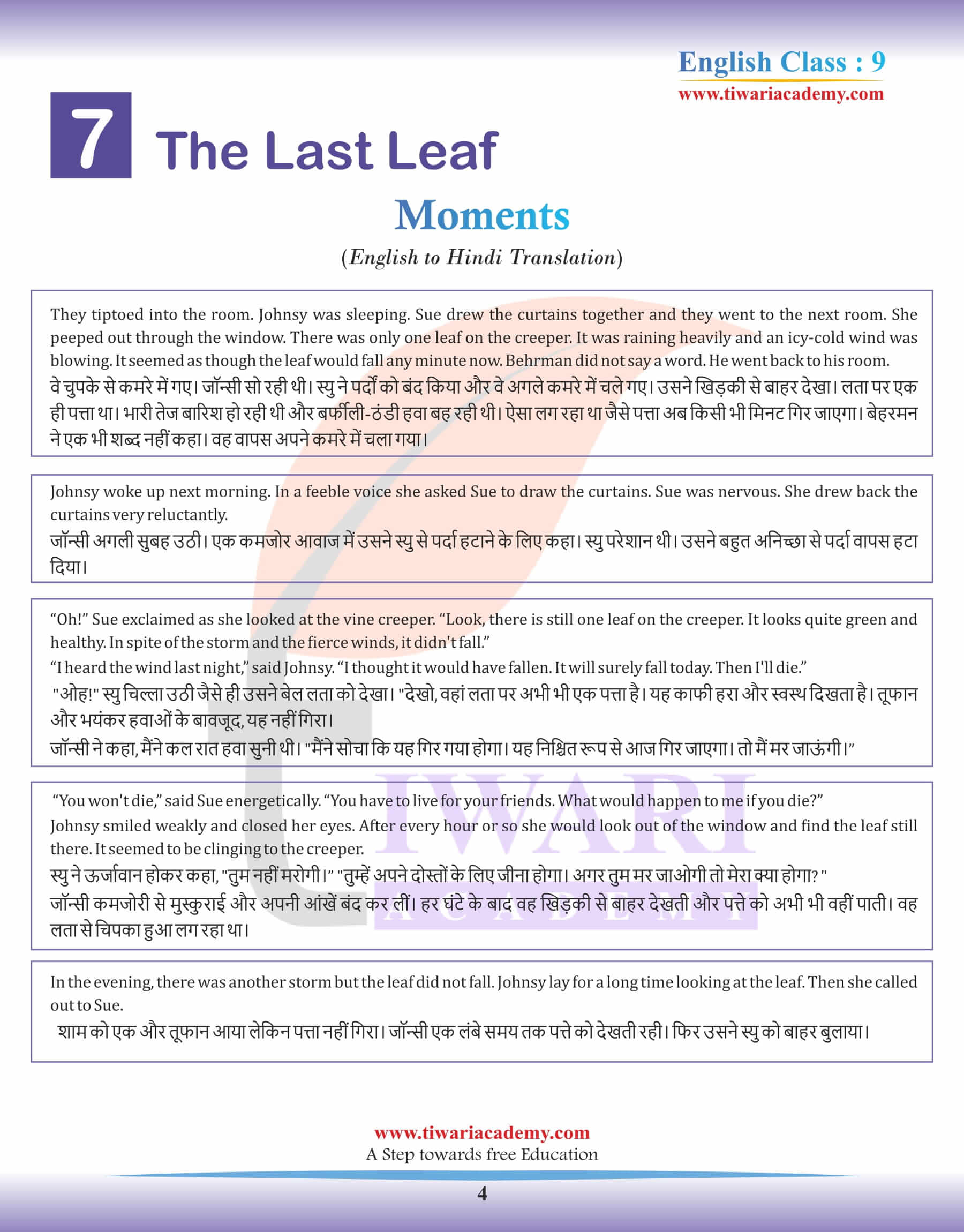 NCERT Solutions for Class 9 English Moments Chapter 7 the Last leaf modified for 2025-26 exams. Tiwari Academy provides solutions and Hindi Translation for 9th English. Student can take the benefits for both the books. It is helpful during the exams and class test preparation. Solutions are free to use and updated for CBSE 2025-26. Answers are too simple to learn.