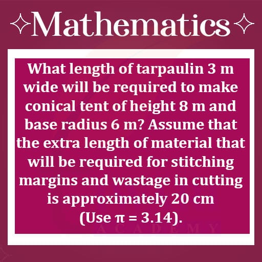 To make a conical tent of height 8 m and base radius 6 m, first calculate the slant height using Pythagoras’ theorem: l = √[8² + 6²] = √[64 + 36] = √[100] = 10 m. The curved surface area is 3.14 × 6 × 10 = 188.4 m². For a 3 m wide tarpaulin, the length needed is 188.4/3 ≈ 62.8 m. Adding 20 cm for margins, the total length required is approximately 63 m.