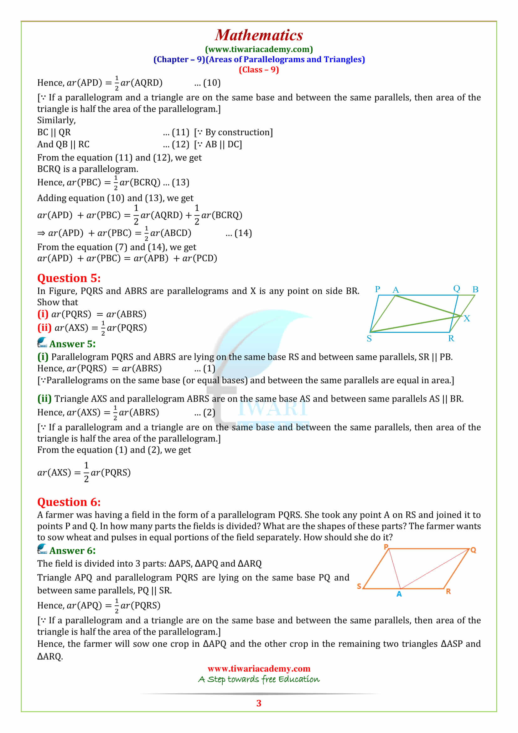 It is advised that students should frequently practice their proofs and do some important questions repeatedly as are given on the website Tiwari Academy. Generally, in the questions given under this exercise, the letters AR are used together to represent the area of the plane figures—the triangle, the parallelogram and similar figures. This has become a convention. It is always suggested that students try to do each and every question in the exercise (though we may suggest certain questions as important).