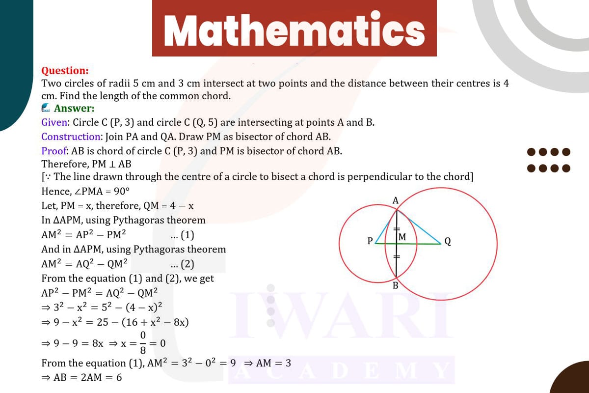 The problem at hand involves two intersecting circles with different radii, specifically 5 cm and 3 cm. These circles intersect at two points, and the distance between their centers is given as 4 cm. The objective is to determine the length of the common chord that these circles share. This problem is a classic example of applying geometric principles, particularly the Pythagorean theorem, to solve real-world problems. Understanding the relationship between the radii of the circles, the distance between their centers, and the properties of the intersecting chord is key to finding the solution.