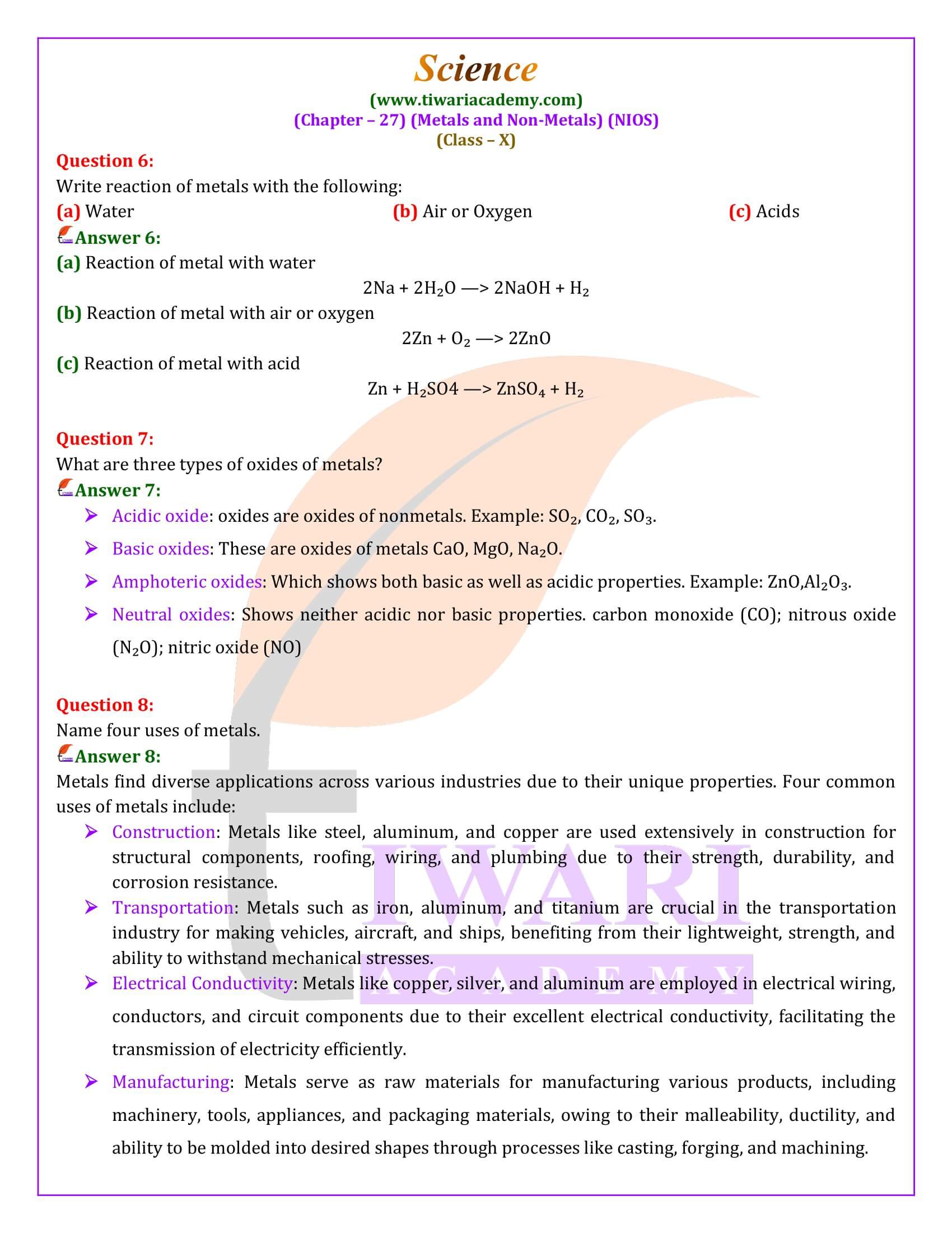Throughout, NIOS Class 10 Science Chapter 27 stresses the educational importance of understanding the properties and uses of metals and non-metals. It encourages interactive activities like experiments to observe the properties of different metals and non-metals, enhancing the learning experience.